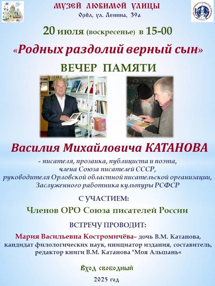 20 июля в Музее любимой улицы вспоминали известного орловского писателя Василия Михайловича Катанова (1930 – 2020).
