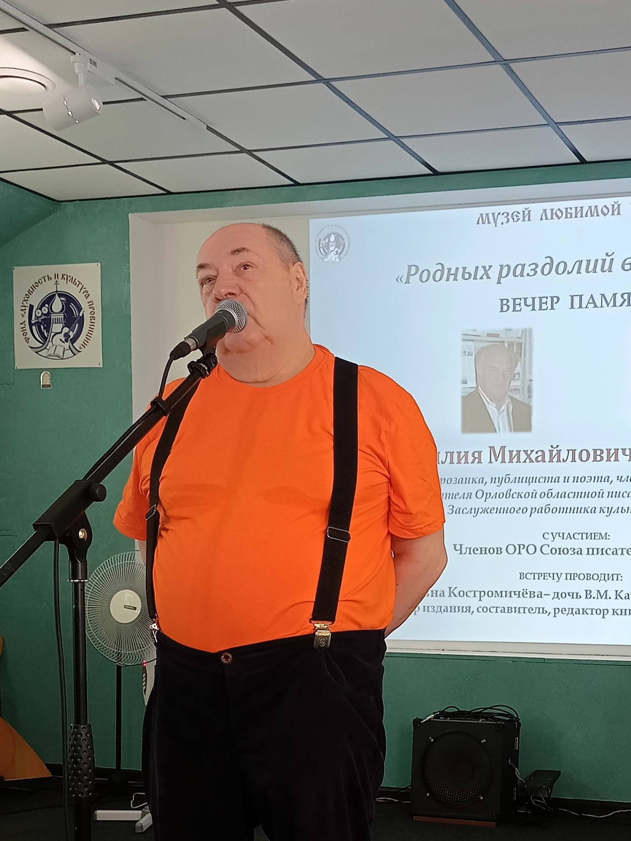 Вечер под названием «Родных раздолий верный сын» стал одним из череды памятных мероприятий, посвящённых 95-летию со дня рождения писателя-краеведа, организованных его дочерью – Марией Васильевной Костромичёвой. Вместе с ней вспоминали замечательного сына орловской земли его коллеги-писатели и почитатели многогранного таланта Василия Михайловича.