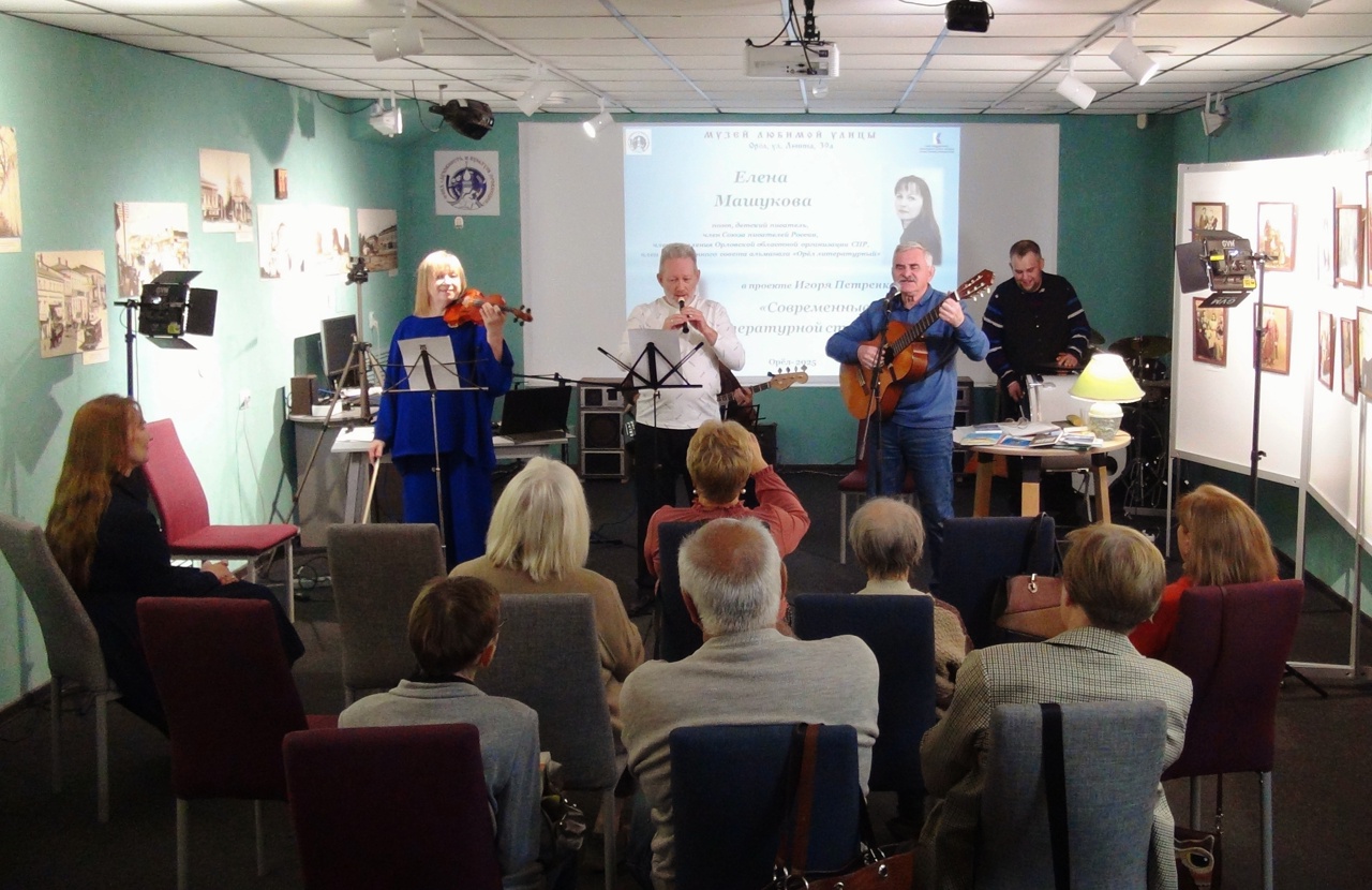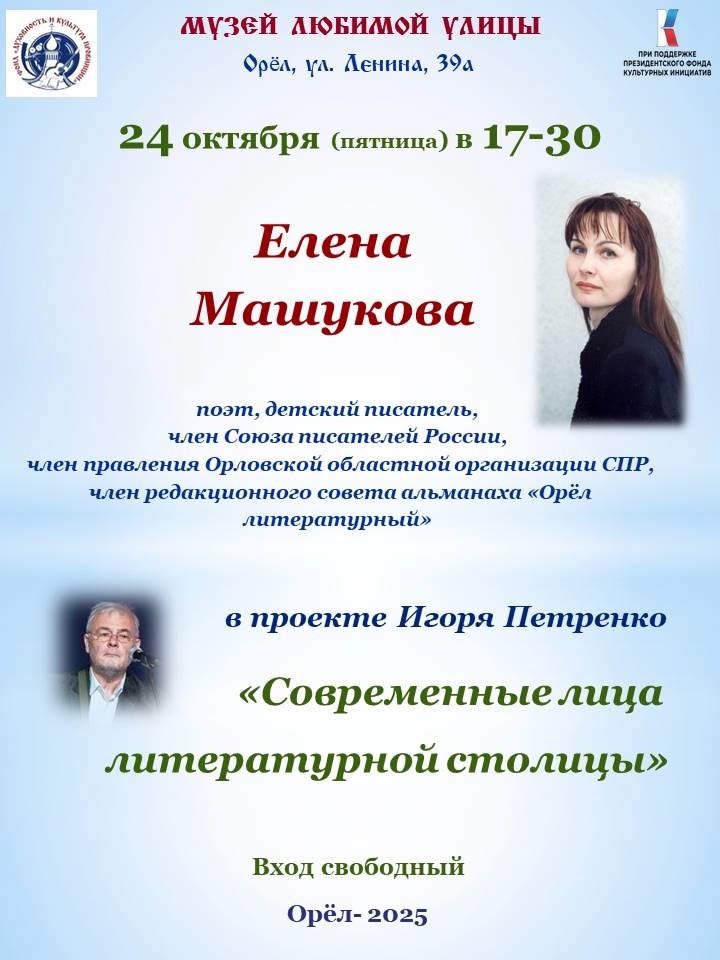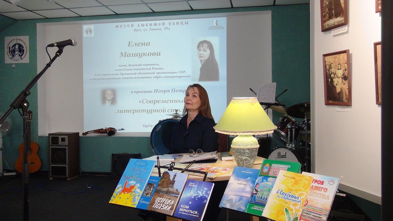 24 октября в Музее любимой улицы состоялась творческая встреча в рамках проекта «Современные лица литературной столицы» с Еленой Машуковой – поэтом, детским писателем, членом Союза писателей России, членом правления Орловской областной писательской организации.