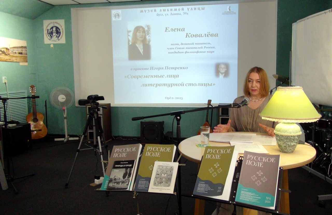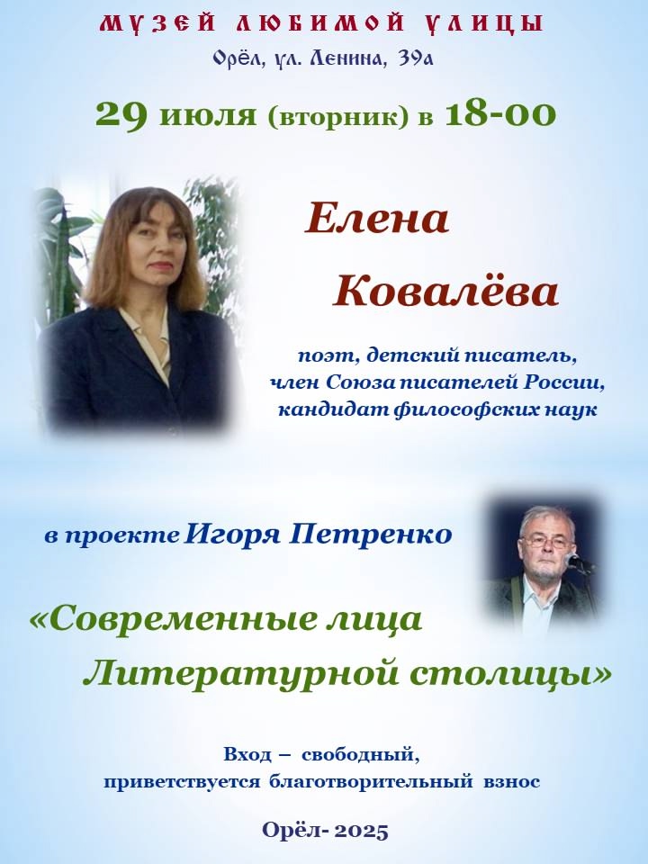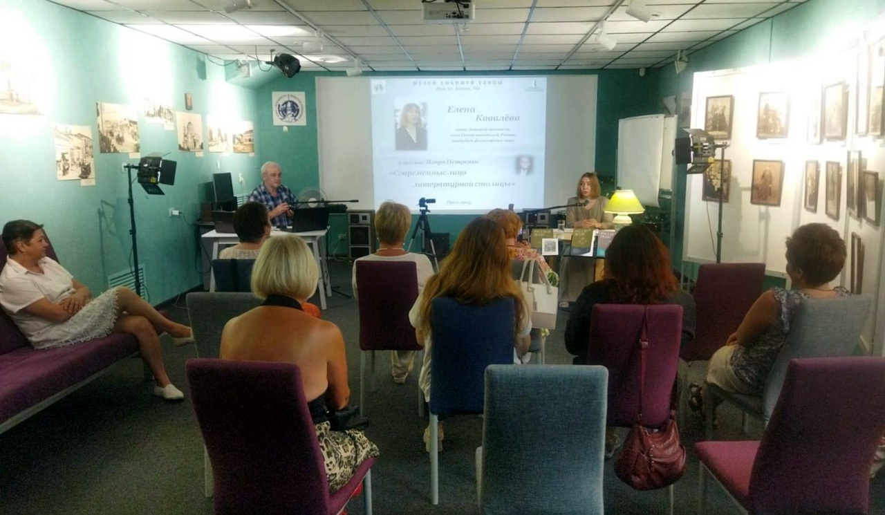 29-го июля в Музее любимой улицы в рамках проекта «Современные лица Литературной столицы» состоялась творческая встреча с Еленой Ковалёвой – поэтом, членом Союза писателей России, кандидатом философских наук, главным редактором литературного журнала «Русское поле».