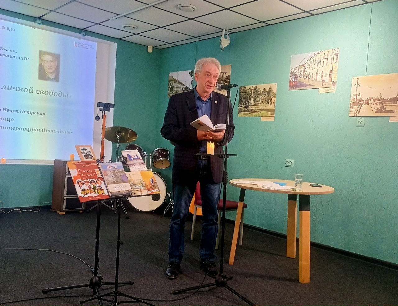 Писатель рассказал о своём творчестве, прочитал стихи и ответил на вопросы ведущего и собравшихся любителей литературы.