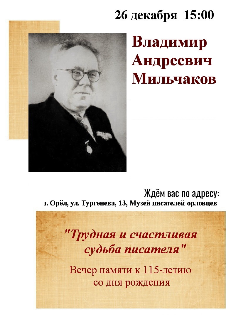 Владимир Андреевич Мильчаков – автор двух поэтических сборников и целого ряда книг об уголовном розыске и войне: «Загадка 602-й версты», «Таких щадить нельзя», «Бой у старого мазара», «Птенцы орлов», «Мои позывные Россия» и др. Он был писателем трудной, но счастливой судьбы, о которой расскажет хорошо известный исследователь творчества орловских писателей — А.И. Кондратенко.